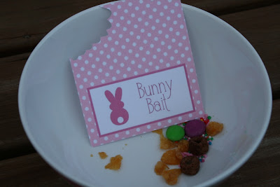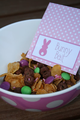 I threw together what ever I could find in the pantry for our Bunny Bait - some cornflakes, a small sample packet of Cocopops, pastel Smarties and ice cream sprinkles. The Bunny Bait signs are a free printable from Bloom Designs.