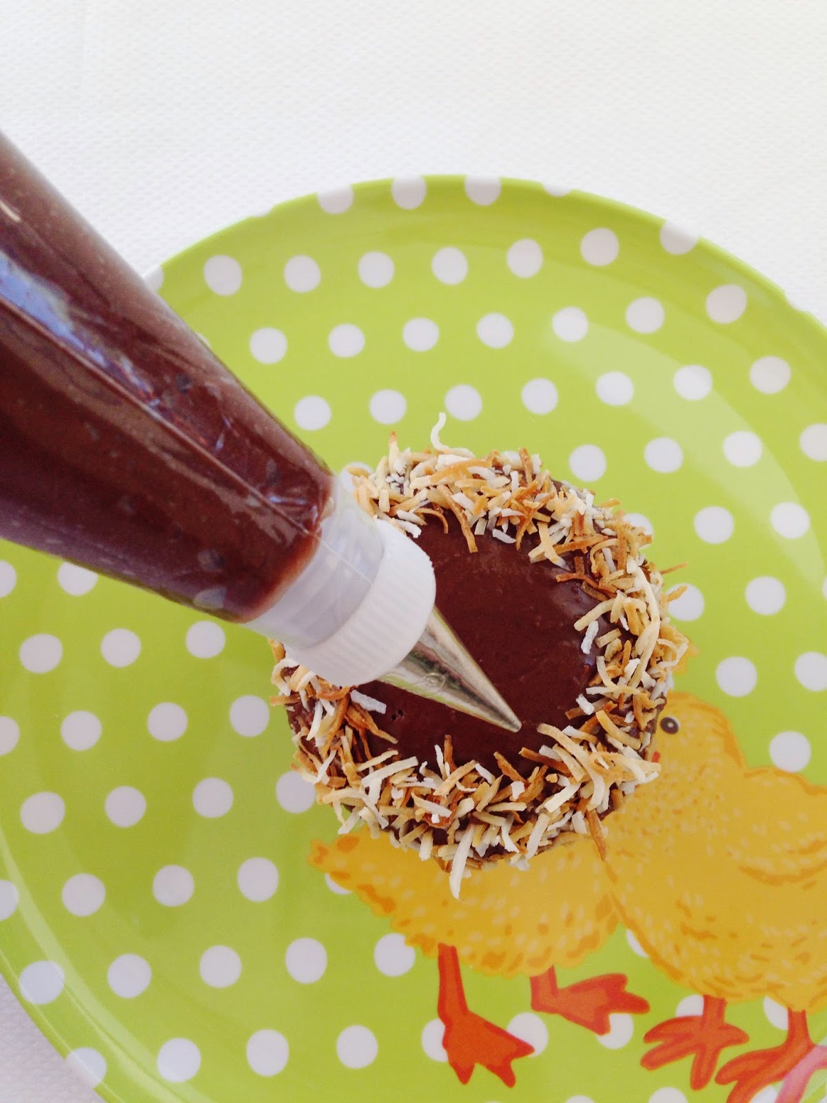 Using a small icing nozzle (I used size 3) pipe circles of chocolate icing around the inside of the coconut to form the nest.