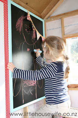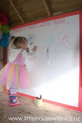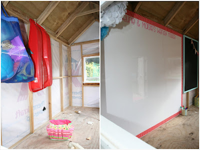 A few years ago my husband built this amazing Wendy House for our girls. It's an actual, real miniature house with a cavity system, sark ceiling, cedar shingle roof and hand made wooden windows! He's a seriously clever man! It's so beautiful and has provided endless hours of fun for our girls and countless other kids. But we never actually got around to finishing the inside. The interior is unlined with exposed nogs, studs and building paper. It's on our "to do list" but other things have always taken priority - like our real house!