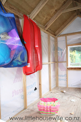 Since winter started the girls haven't spent too much time in there. It's mainly been used for outdoor toy and bike storage. Its strewn with beach toys, upturned chairs, skipping ropes, an old dial telephone and the girls gardening tools.