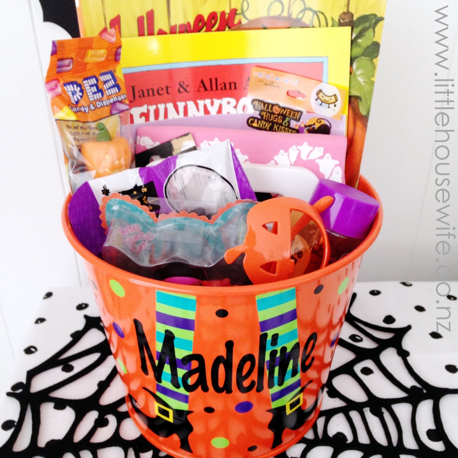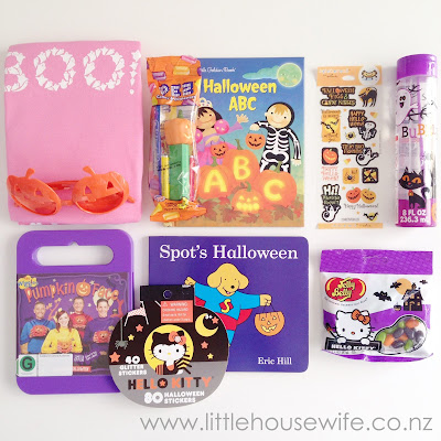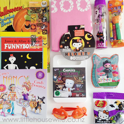 Maddie's basket includes Vintage Halloween Colouring Book, Funnybones (I had this book when I was little!) and Fancy Nancy Candy Bonanza. Hallmark Halloween Stickers from Ikes Emporium. BOO Halloween Pyjamas from Gymboree. Hello Kitty stickers, Hello Kitty Halloween Jelly Bellys and Halloween Bubbles from Martha's Backyard. Caspers Scare School DVD only $2 from The Warehouse. Pumpkin Glasses from Look Sharp Store. Halloween Pez (my parents brought back from Las Vegas). And a Lalaloopsy Halloween Mini Doll which I bought on eBay to add to the girls collection.