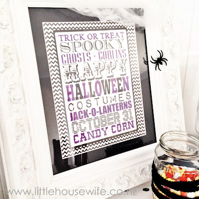 Bats and glitter pumpkins from Spotlight. Pumpkin head, cobwebs, black netting and spider garland from The Warehouse. Spiders web placemats from Look Sharp Store. Halloween subway printable from Eighteen 25.