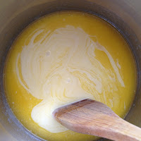 Melt butter and condensed milk on a low heat then allow to cool slightly.