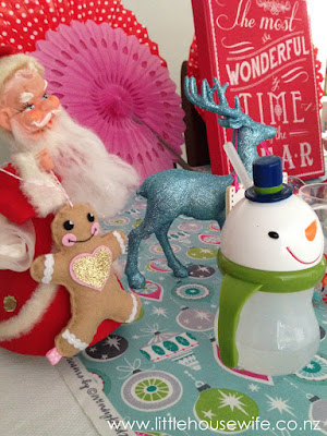 The Gingerbread Man was handmade by Maisie-Moo. I just adore that vintage Santa that it's hanging off. It was my Grammys and it still has the price written in shillings on the bottom of it!