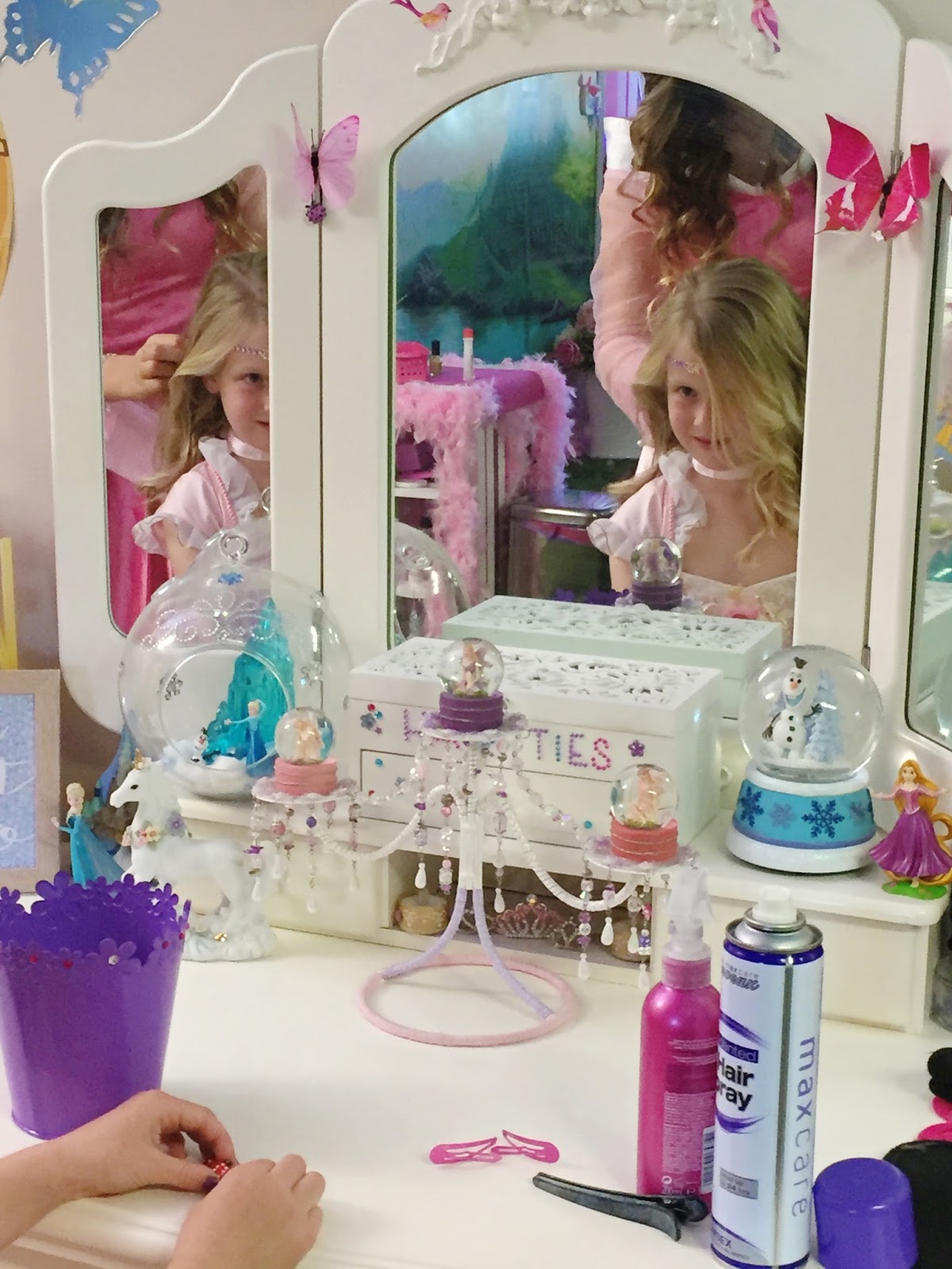 Followed by a wee pampering session. The girls had their nails painted and their hair curled at a special mirrored table. They accessorized with a gemstone tiara and princess henna on their hands. By this point my girls were absolutely smitten with the princesses and my big girl could not wipe the smile from her face!